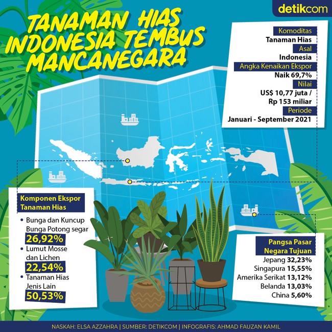 Lembaga Pembiayaan Ekspor Indonesia (LPEI)/Indonesia Eximbank mencatat jika terjadi kenaikan signifikan pada ekspor tanaman hias periode 2021. Yaitu naik hingga 69,7% periode Januari-September 2021 dibandingkan periode yang sama tahun sebelumnya.