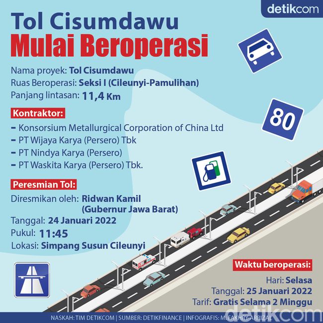 Jakarta - Ruas Jalan Tol Cileunyi Sumedang Dawuan atau tol Cisumdawu seksi 1 yang menghubungkan kawasan Cileunyi-Pamulihan sepanjang 11,4 KM akan dioperasikan besok, Selasa (25/1/2022).