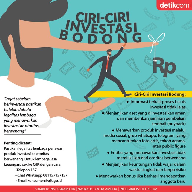 Jangan mudah percaya dengan tawaran investasi dengan janji manis cuan besar. Bisa jadi ujung-ujungnya terjebak dalam investasi bodong. Nah, supaya nggak masuk perangkap investasi bodong, cek dulu yuk ciri-cirinya yang dirangkum dalam infografis berikut ini. Langsung cek!