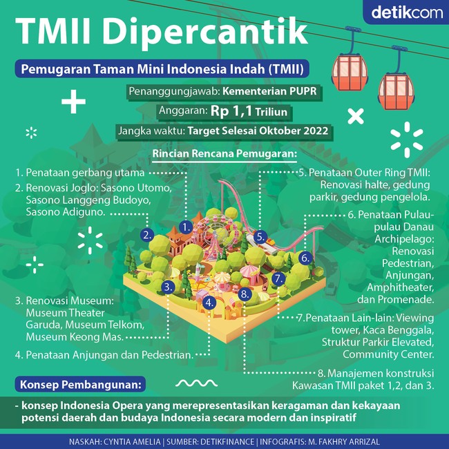 Jakarta - Taman Mini Indonesia Indah (TMII) bakal menjalani proses pemugaran. Proses mempercantik TMII ditargetkan rampung pada Oktober 2022 nanti. Pengin tahu apa saja yang bakal dipoles di TMII? Cek selengkapnya dalam infografis berikut ini.