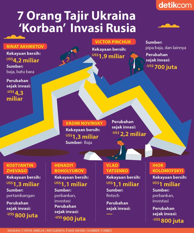 Mengutip Forbes, Minggu (10/4/2022), invasi ini membuat kekayaan miliarder Ukraina terjun bebas. Berikut informasinya dirangkum dalam infografis