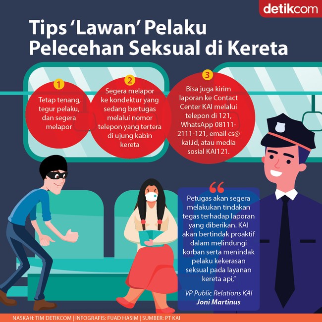 Jakarta - PT Kereta Api Indonesia (KAI) memberikan tips untuk 'melawan' sekaligus melapor pelaku pelecehan seksual di kereta. Langsung cek infografis berikut ini.