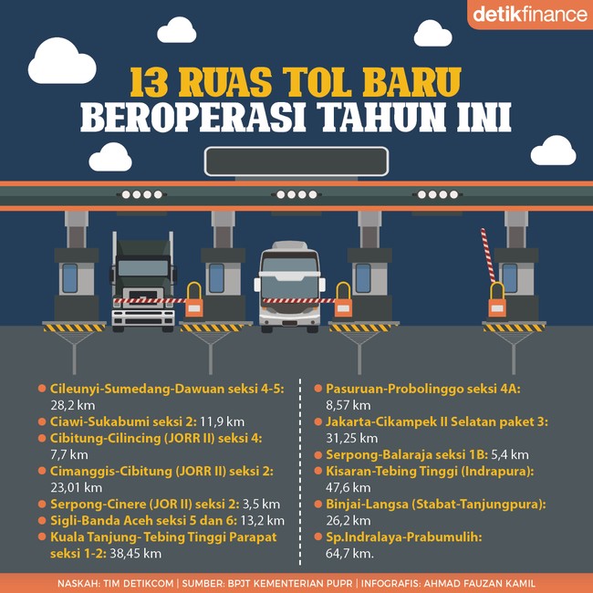 Jakarta - Badan Pengatur Jalan Tol Kementerian Pekerjaan Umum dan Perumahan Rakyat (PUPR) menargetkan 13 ruas tol baru mulai beroperasi tahun ini. Apa saja ruas tol tersebut? Langsung klik infografis di atas.