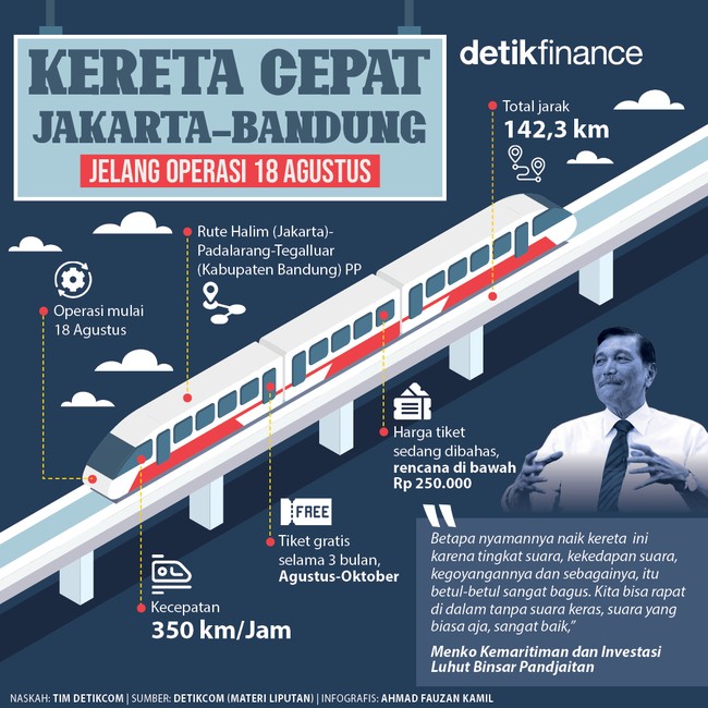 Kereta Cepat Jakarta-Bandung terus menjalani uji coba jelang operasi Agustus nanti. Jika tidak ada perubahan, Kereta Cepat Jakarta-Bandung mulai beroperasi pada 18 Agustus 2023. Berikut informasi seputar Kereta Cepat Jakarta-Bandung dirangkum dalam infografis.