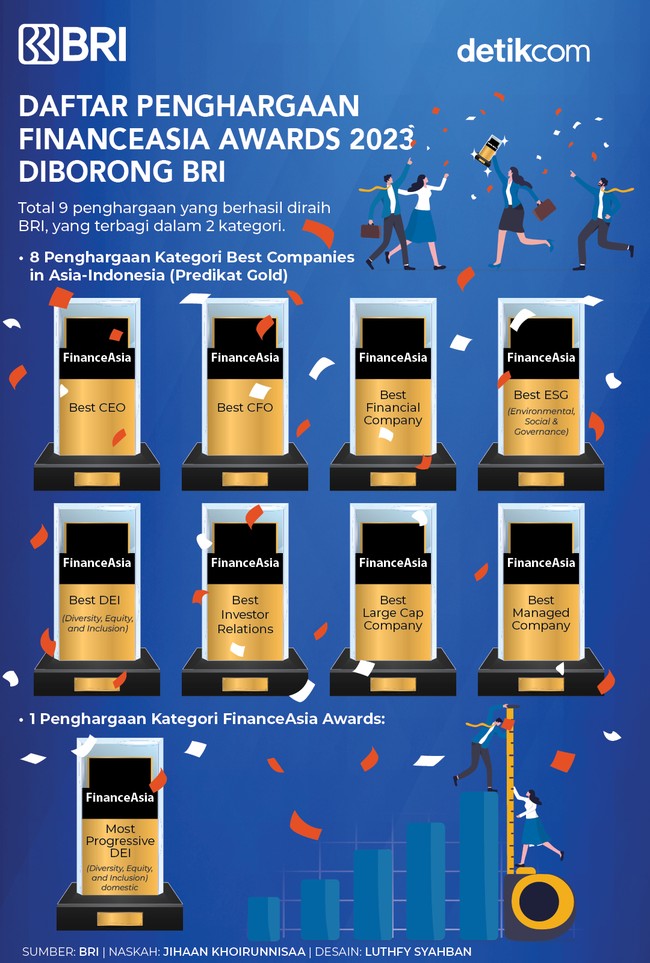 Jakarta - BRI berhasil memboyong 9 penghargaan internasional dalam ajang FinanceAsia Awards 2023 di Hong Kong. Direktur Utama BRI Sunarso meraih kategori Best CEO.