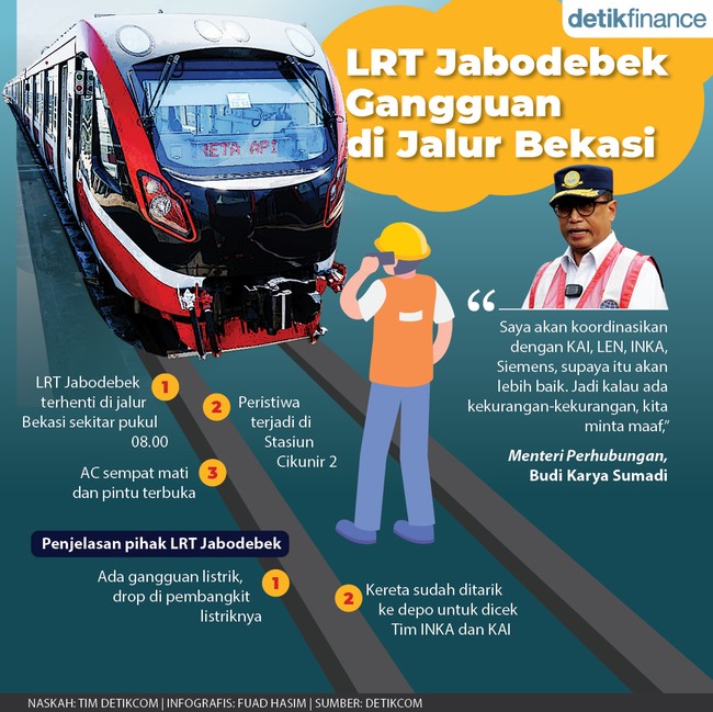 Jakarta - LRT Jabodebek jalur Bekasi sempat terganggu, dan terhenti. Peristiwa tersebut terjadi di Stasiun Cikunir 2 sekitar pukul 08.00, Rabu (30/8/2023). Apa penyebabnya? berikut informasi dirangkum dalam infografis berikut ini. Langsung klik infografis di atas.