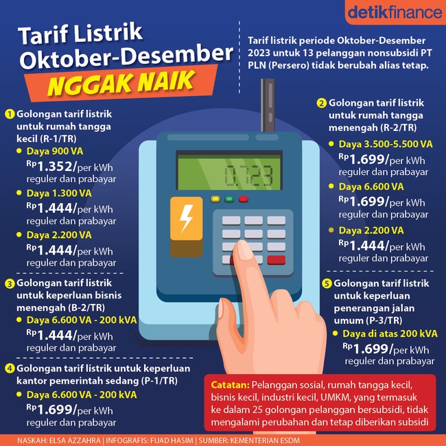 Jakarta - Demi menjaga daya beli masyarakat dan daya saing industri, Pemerintah melalui Kementerian Energi dan Sumber Daya Mineral (ESDM) memutuskan tarif listrik triwulan IV atau periode Oktober-Desember 2023 untuk pelanggan nonsubsidi PT PLN (Persero) tetap alias tidak naik.