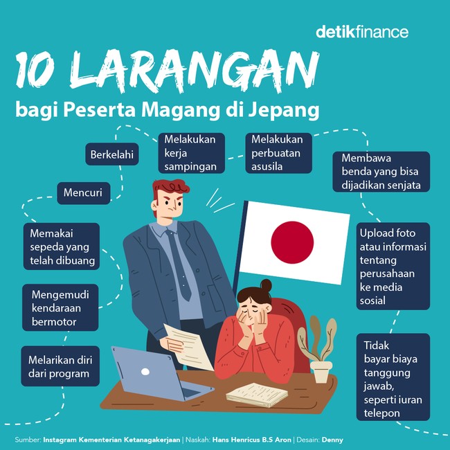 Jakarta - Kementerian Ketenagakerjaan (Kemnaker) merilis 10 hal yang tidak boleh dilakukan saat magang di Jepang. Apa saja? Langsung cek infografis berikut ini. Klik infografis di atas.
