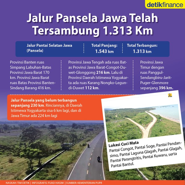 Jakarta - Jalur Pantai Selatan (Pansela) Pulau Jawa Kini telah tersambung 1.313 kilometer. Alhasil, jalur alternatif menuju daerah-daerah di Jawa pun semakin terbuka. Bukan itu saja, selama melewati jalur Pansela disuguhkan pemandangan indah, salah satunya kawasan pantai.