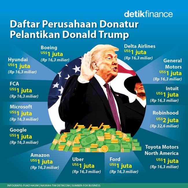 Di balik pelantikan tersebut, ternyata ada sumbangan dari sejumlah perusahaan raksasa Amerika Serikat. Perusahaan apa saja? Langsung klik infografis di atas.