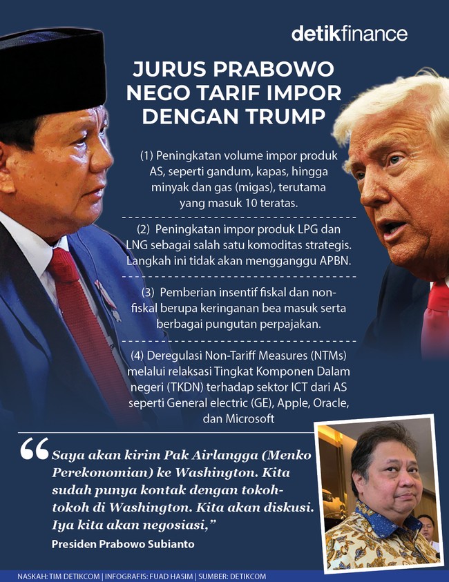 Airlangga pun menyampaikan bocoran sejumlah jurus yang dipakai untuk bernegosiasi dengan Pemerintah AS. Apa saja jurusnya? Langsung klik infografis di atas.