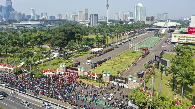 Demonstrasi besar-besaran terjadi di sekitar Gedung DPR/MPR RI. Jalan Tol Dalam Kota yang letaknya bersebrangan dengan Gedung DPR pun mulai dijaga ketat.