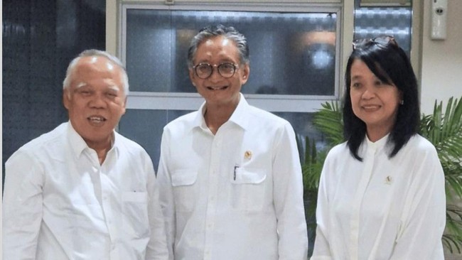 Menteri Pekerjaan Umum (PU) Dody Hanggodo didampingi Wamen PU Diana Kusumastuti bertemu Kepala Otorita Ibu Kota Nusantara (OIKN) Basuki Hadimuljono. Pertemuan ini dilakukan usai pelantikan Basuki sebagai Kepala OIKN.