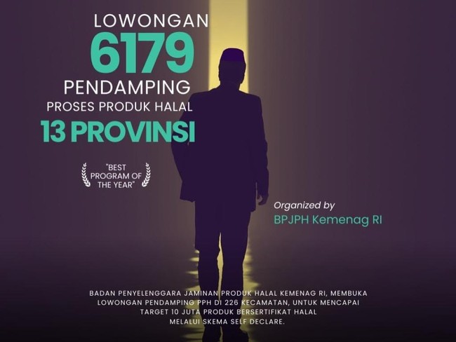 Badan Penyelenggara Jaminan Produk Halal (BPJPH) membuka rekrutmen 6.179 Pendamping Proses Produk Halal (Pendamping PPH). Proses rekrutmen ini dilakukan secara online melalui laman ptsp.halal.go.id mulai 15-31 Agustus 2022.