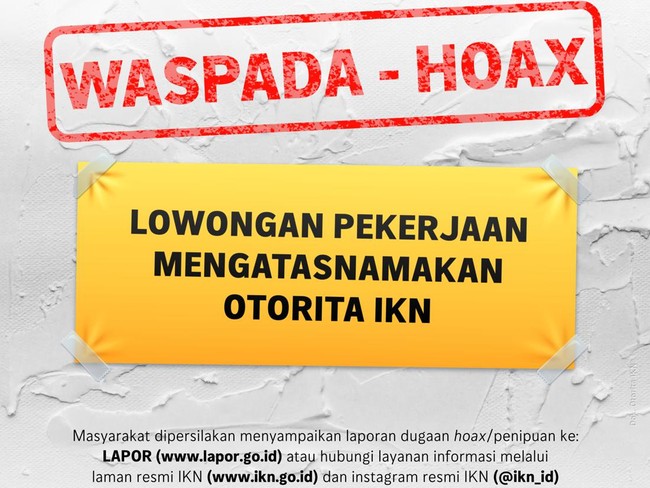 Otorita Ibu Kota Nusantara (OIKN) mewanti-wanti masyarakat waspada hoax lowongan kerja (loker). Loker itu mengatasnamakan OKIN dan beredar belakangan ini.