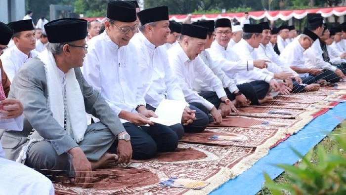 Perry mengenakan peci baju koko putih dan celana hitam. Usai salat Ied Perry didampingi istrinya Wulandari Prasetyoningsih dan anak-anaknya menuju gedung D BI untuk ramah tamah dengan keluarga besar BI.