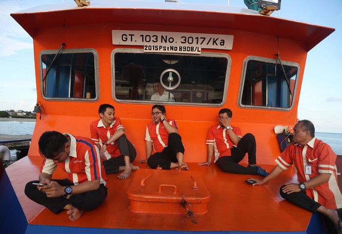 "Ya begini kalau kehidupan staf kapal BRI di malam hari setelah melayani nasabah. Kadang kami bakar ikan, beli di nelayan. Biasanya juga sekadar ngopi dan duduk di depan kapal. Ada juga yang di bawah nonton televisi atau main game online sambil bercanda," ujar Mualim (perwira kapal di bawah nakhoda) Teras BRI Kapal Bahtera Seva I, Widodo.