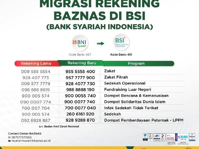 Berikut perubahan - migrasi rekening zakat, infaq dan sedekah BAZNAS dari BNI Syariah ke Bank Syariah Indonesia (BSI). Langsung klik halaman berikutnya.