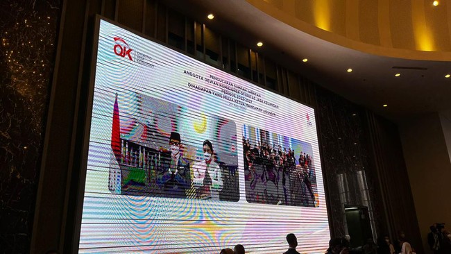Dari pantauan detikcom Ketua OJK Mahendra berada di ruangan terpisah karena positif COVID-19. Sementara ADK lain berada di ruang pelantikan.