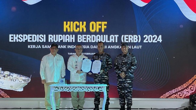 Bank Indonesia (BI) bersama TNI Angkatan Laut (AL) menggelar acara Ekspedisi Rupiah Berdaulat (ERB). Sebagai pembuka 2024 ini, BI dan TNI AL akan membawa uang senilai Rp 8 miliar ke 4 pulau di Kalimantan.