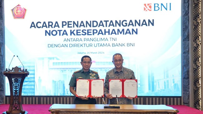 Sinergi ini diwujudkan melalui penandatanganan Nota Kesepahaman (MoU) antara Panglima TNI Jenderal TNI Agus Subiyanto dengan Direktur Utama BNI Royke Tumilaar di Wisma Ahmad Yani, Jakarta, pada Selasa (26/3/2024) lalu.