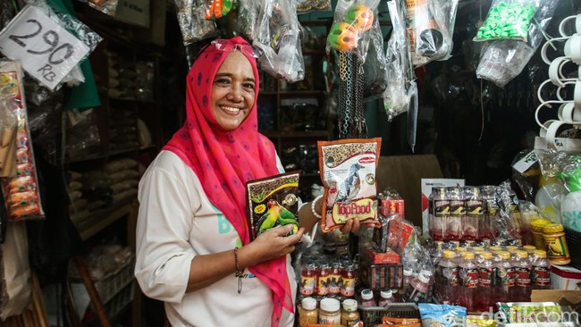Salah satunya kios Sri Wati (58), wanita asal Manggarai Jakarta ini tengah bergantian menjaga kios bersama sang suami, tak ada burung yang dijual sebab kios Sri ini menjual pakan burung, kucing, kelinci dan berbagai aksesorisnya.