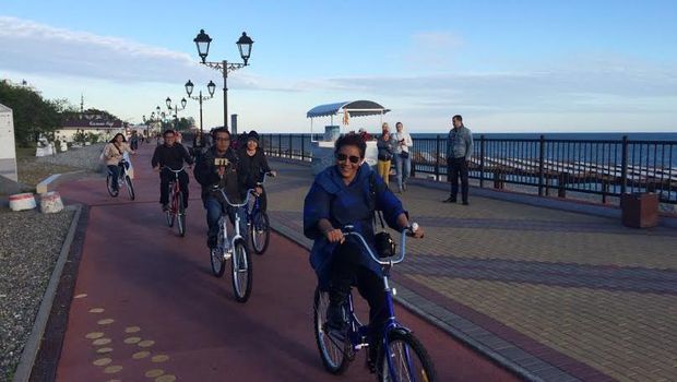 Setelah seharian berunding dan bertemu dengan para delegasi negara lain, Susi memilih rileks dan menikmati kota Sochi dengan cara bersepeda santai sore-sore.