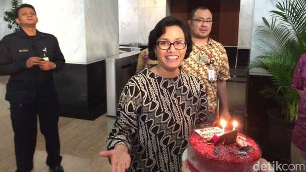 Wajah Sri Mulyani yang terlihat lelah itu, seketika berubah riang setelah menerima ucapan selamat ulang tahun dari para awak media yang menunggu di lobi Kantor Kementerian Keuangan.