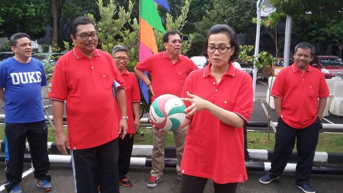 Sri Mulyani yang mengenakan pakaian olahraga berwarna merah lengkap dengan sepatu berwarna merah muda. Ia tiba di lokasi sekitar pukul 07.20 WIB. Sesampainya di lokasi, Sri Mulyani langsung memasuki arena lapangan bola voli. Olahraga ini memang jadi salah satu kegemaran mantan Direktur Bank Dunia tersebut.