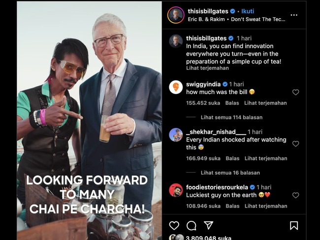 Viral di media sosial bos Microsoft, Bill Gates, mencicipi teh susu yang disajikan seorang penjual chai di India. Momen itu dibagikan Gates melalui akun Instagram pribadinya (@thisisbillgates).